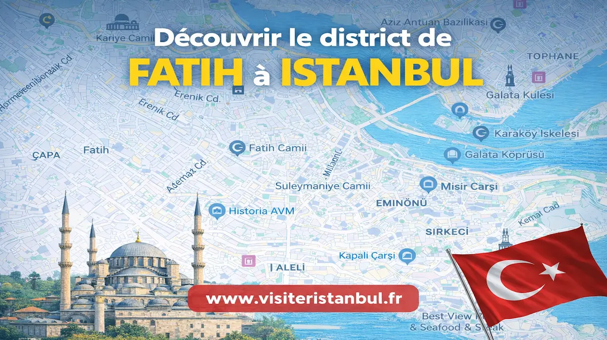 Fatih est le district du centre historique d’Istanbul, sur la péninsule historique (l’ancienne Constantinople). Il englobe notamment des zones comme Sultanahmet et Eminönü, qui font partie du même district aujourd’hui.